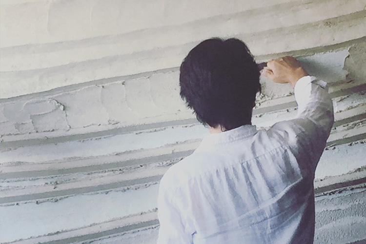 現場では企画段階から参加することが多く、デザインも提案し、伝統的な左官技術とオリジナリティーに富むアイディアが高い評価を受ける一方、アート作品でも注目される久住はいずれにおいてもやわらかい土の存在感を大切にし、日差しや風など現場の自然から感じたことを表現している。