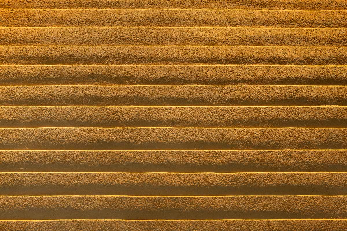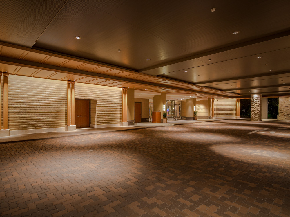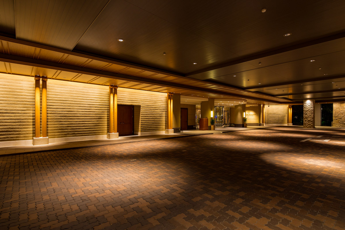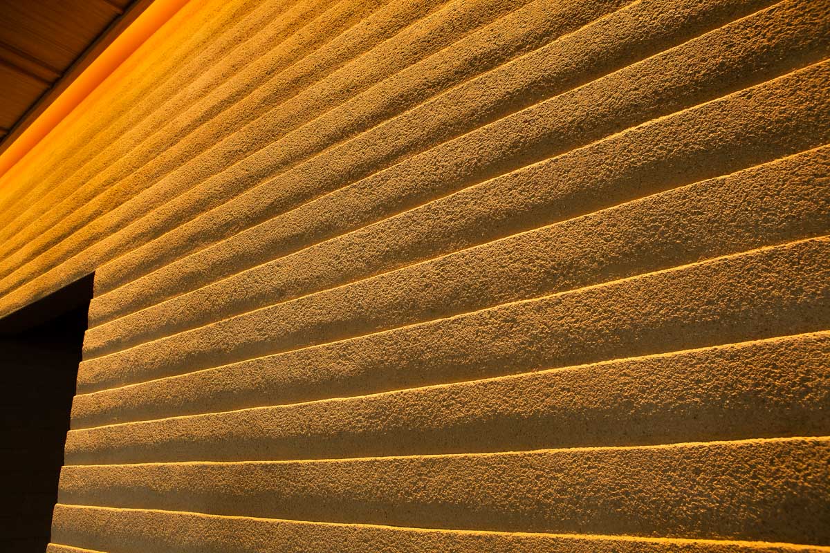 1階の約50mのメインエントランスの土壁は、光があたる陰影が美しい波状の壁で「和」を表現しました。