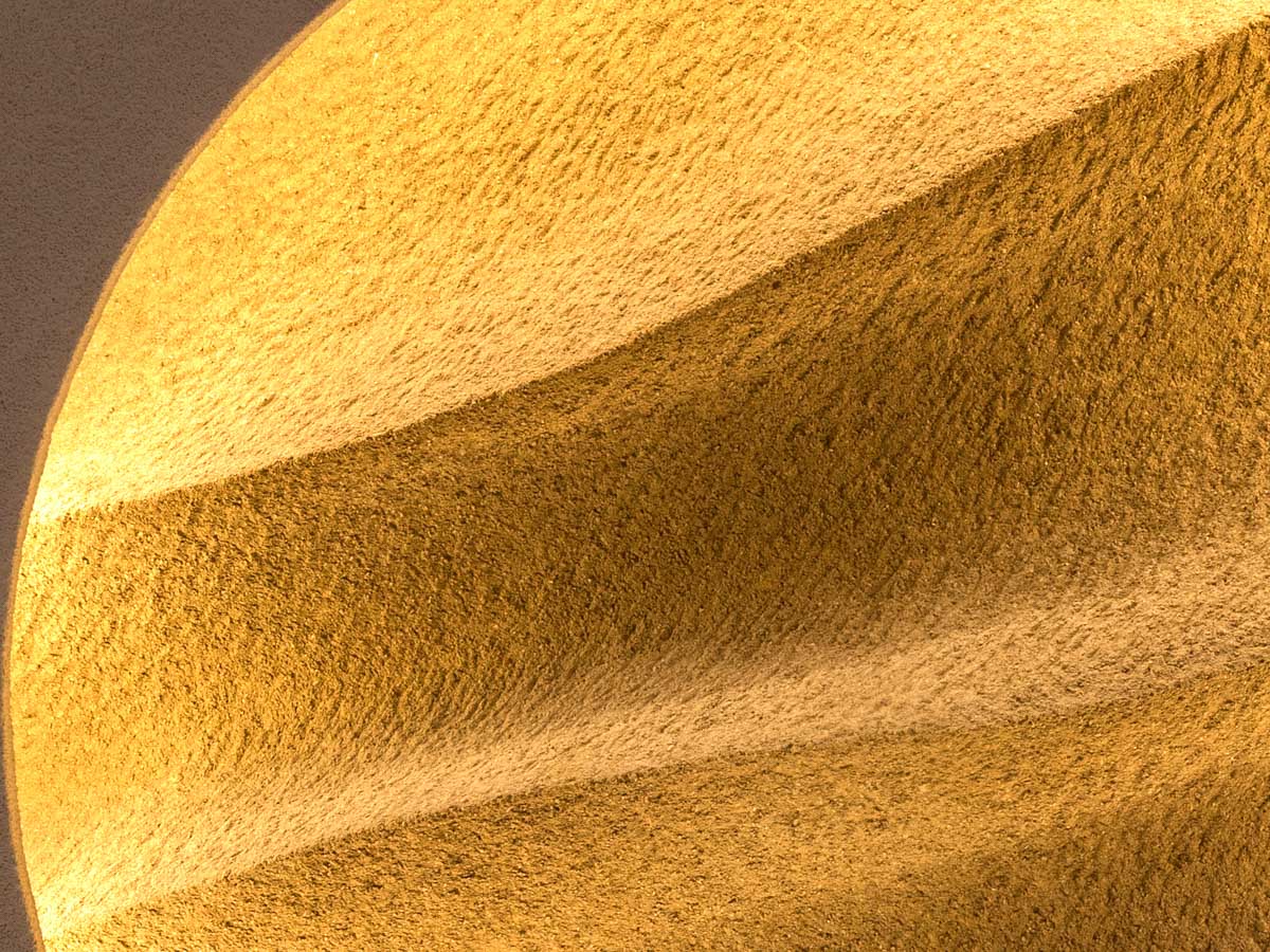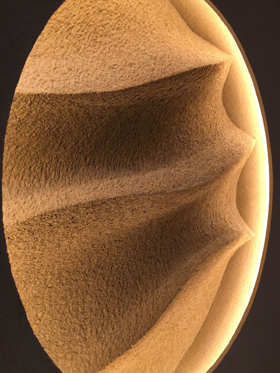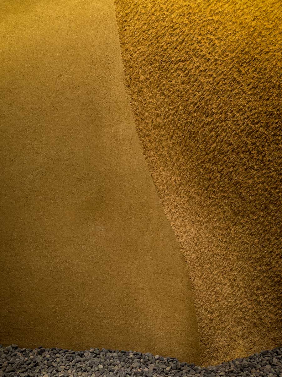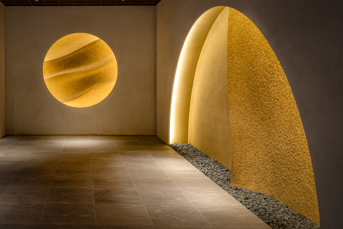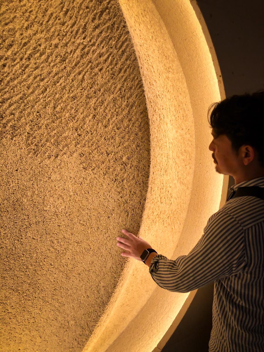 一階エレベーターホールにある半円型の大壁は、二つの対象的なテクスチャーで構成され