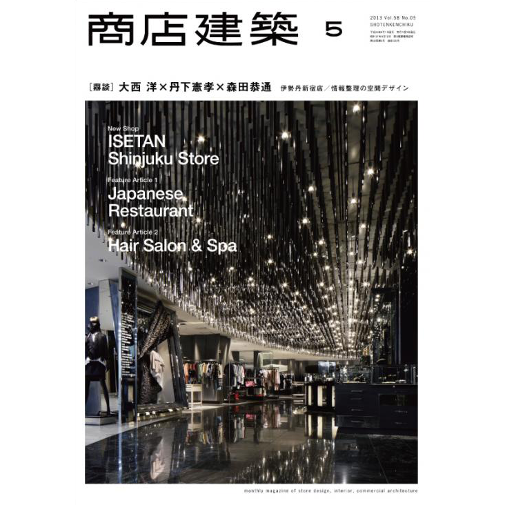 2013.05.10 商店建築社『商店建築』Vol.58 (2013年5月号) 雑誌・書籍掲載情報 商店建築社『商店建築』 (2013年5月号) にて、久住有生が参加させていただいた伊勢丹新宿店、白金料庭 槐樹が掲載されました。 幻冬舎『GOETHE』 (5月号・3月24日発売) 前の記事 扶桑社『Numero』 No.68 (7、8月合併号・5月28日発売) 次の記事