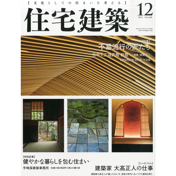 2014.12.01 建築資料研究社 『住宅建築』 (第448号・2014年12月1日発行) 雑誌・書籍掲載情報 建築資料研究社 『住宅建築』 (第448号・2014年12月1日発行)竹中大工道具館 新館 (兵庫県・神戸市)多岐にわたり掲載されました。 公益財団法人 竹中大工道具館建築資料研究社 『住宅建築』『住宅建築』 (第448号・2014年12月1日発行) パナソニックの住まい・くらし方情報 「Sumu-Sumuすむすむ」 前の記事 パナソニックWEBサイト パナソニックの住まい・くらし方情報「Sumu-Sumuすむすむ」 次の記事