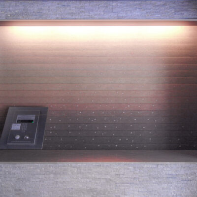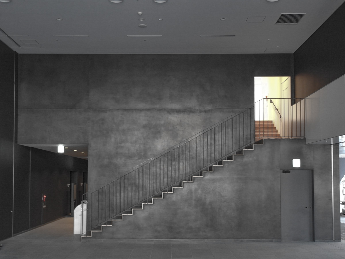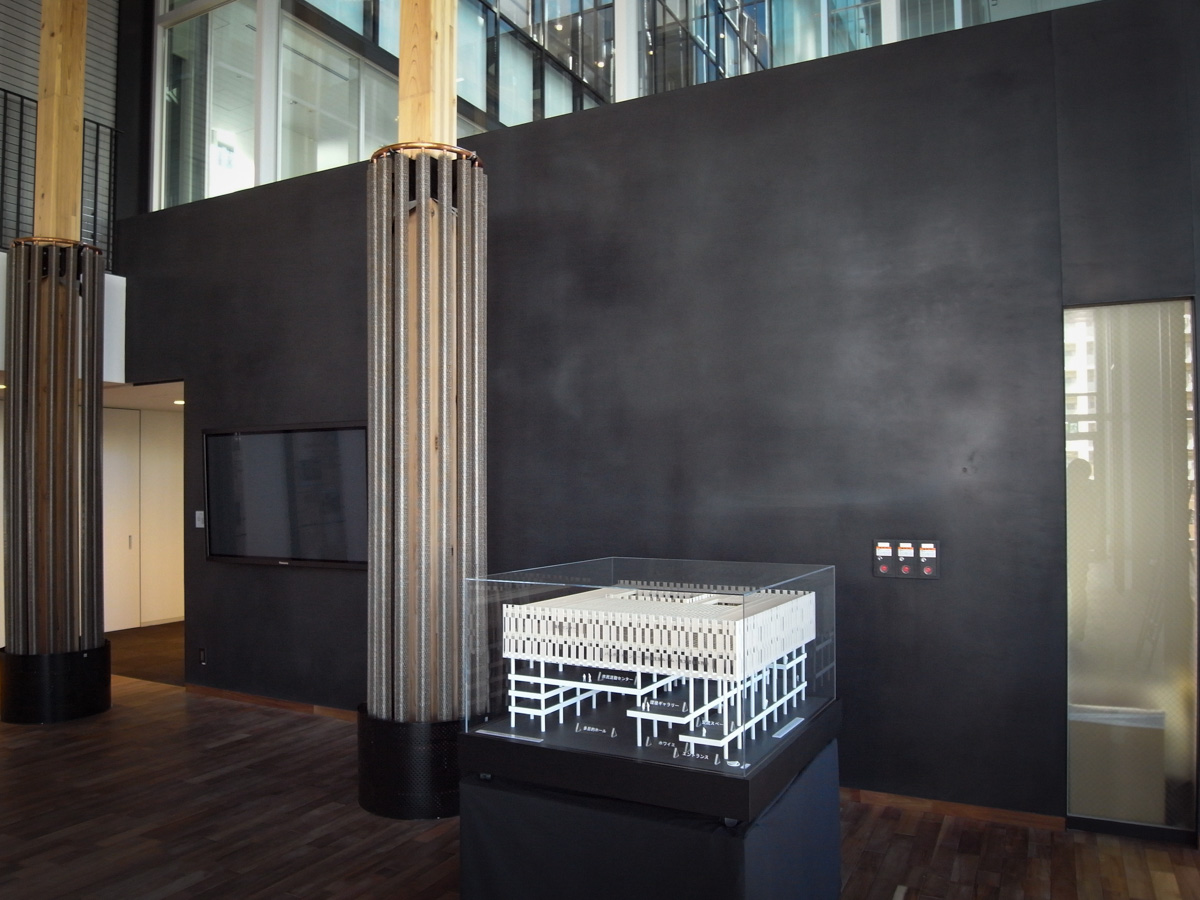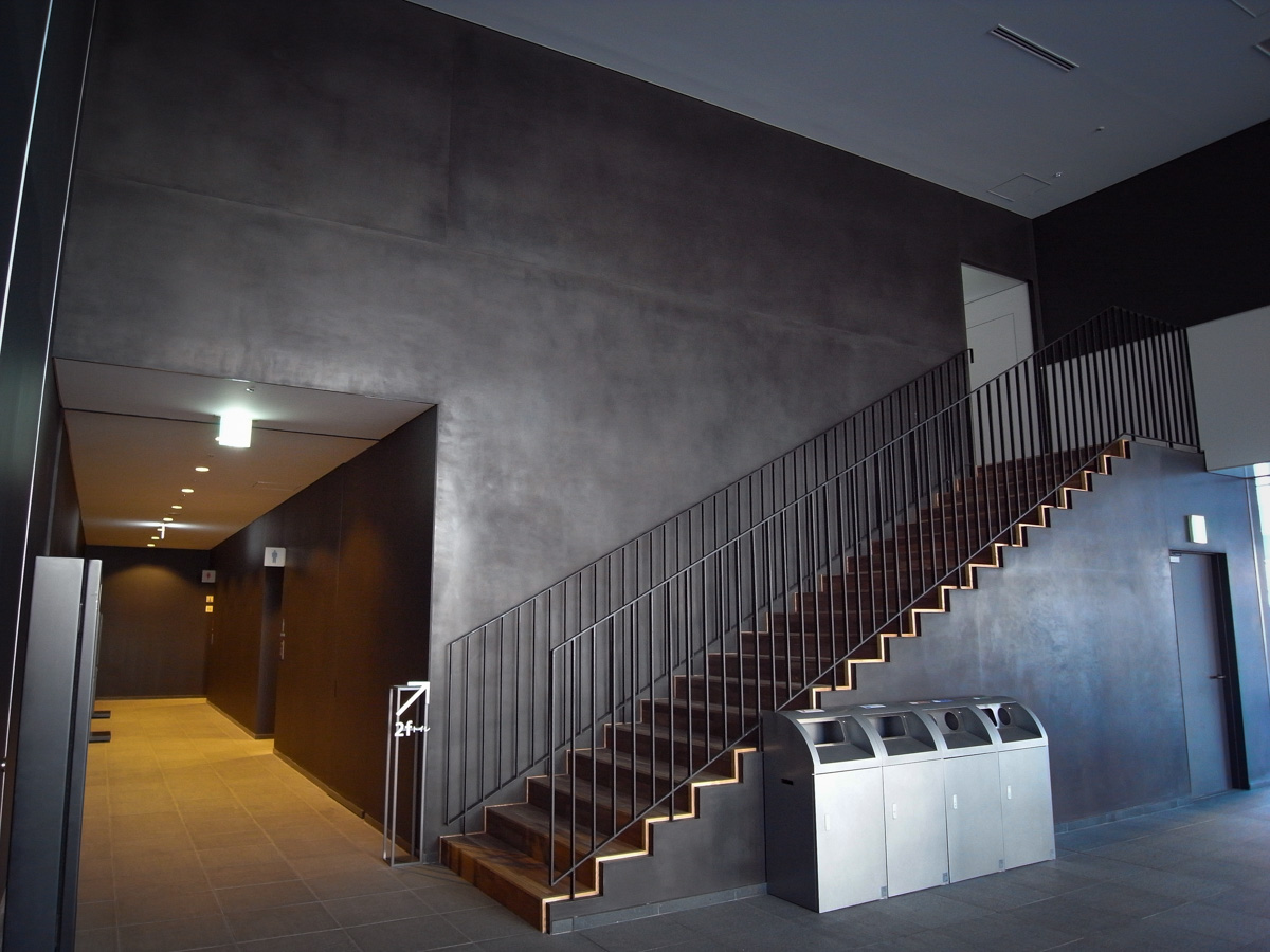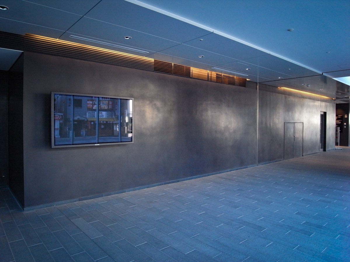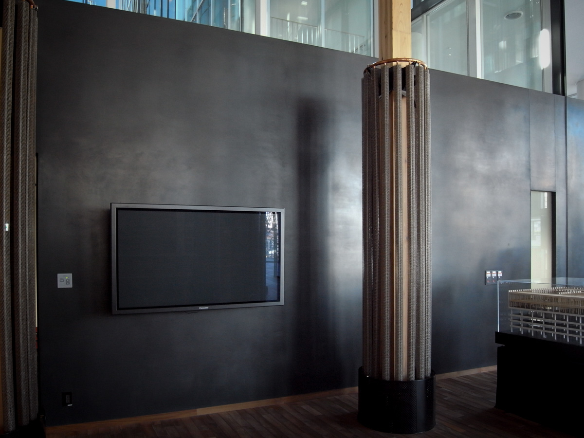 交流スペースの壁計270㎡を黒磨きで仕上げました。