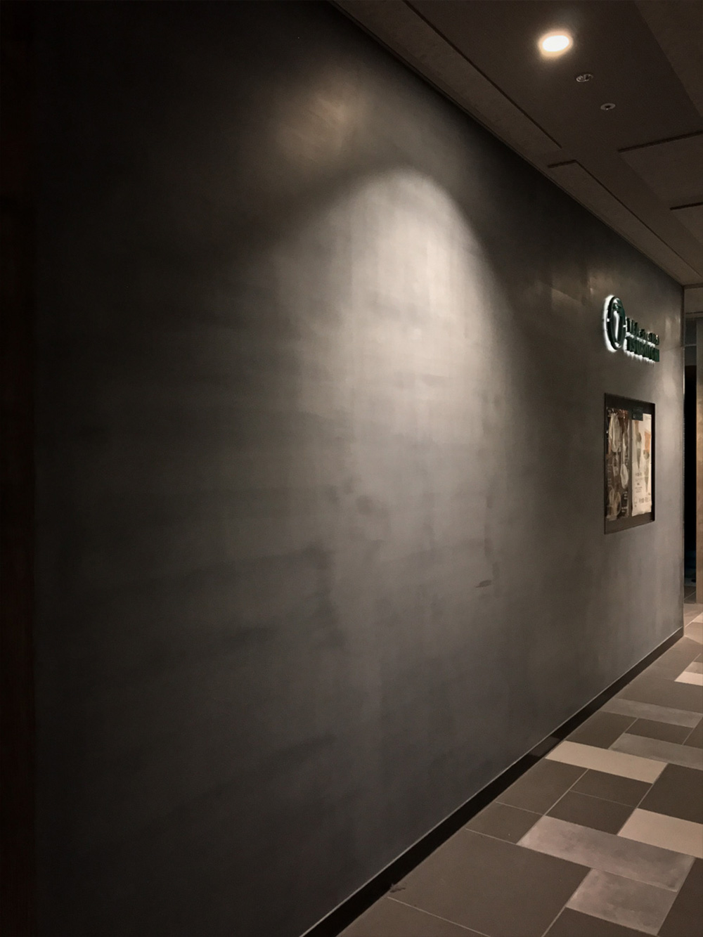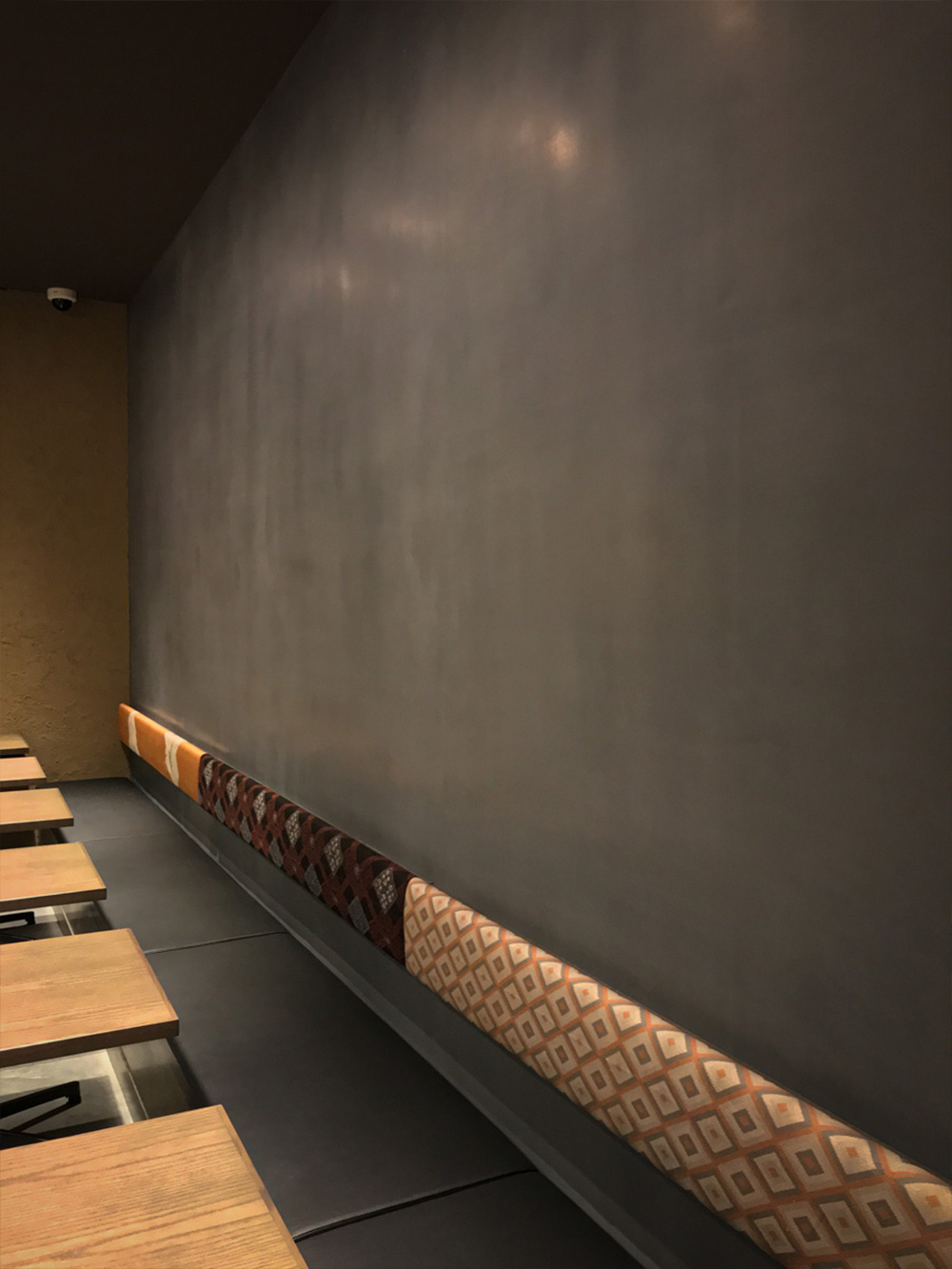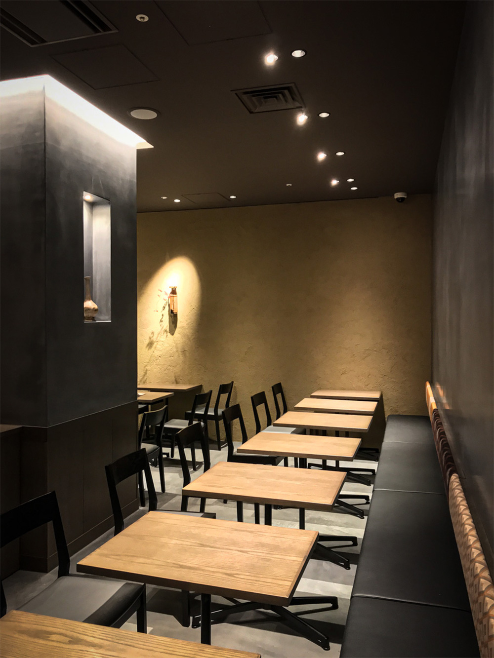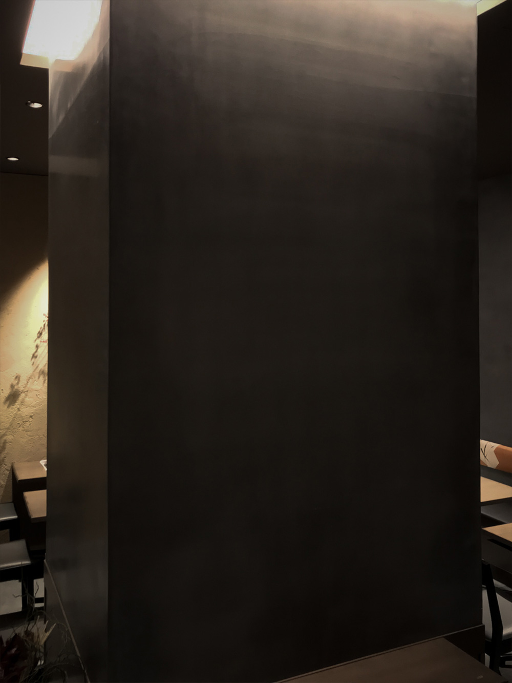 飲食店 茶寮 つぼ市製茶本舗 なんば店 2018年8月 (大阪府 大阪市) 大阪のなんばスカイオ内5階に新しくオープンした茶寮「つぼ市製茶本舗」黒漆喰磨きという仕上げを、壁や柱に施しました。 設計 Infix × MIGIRI Design Office 茶寮 つぼ市製茶本舗 なんば店 ウェブサイト