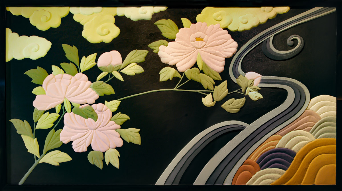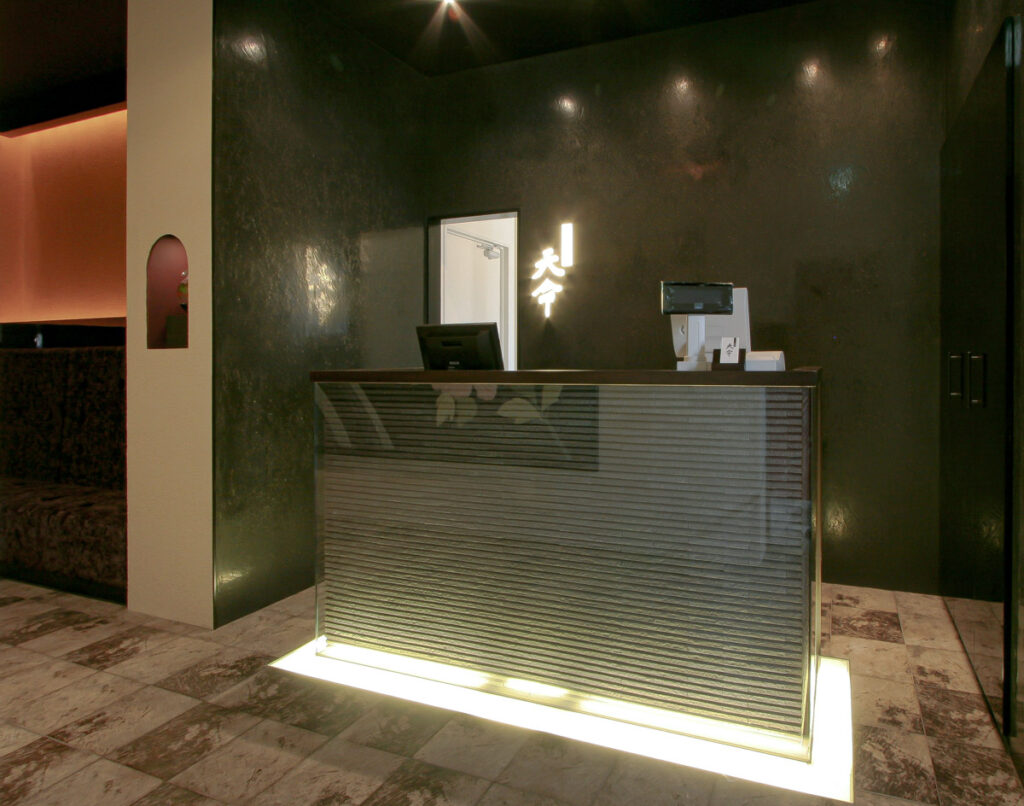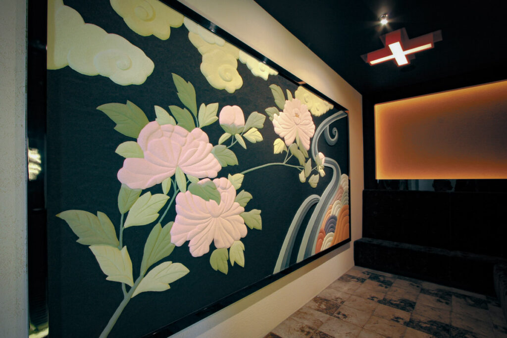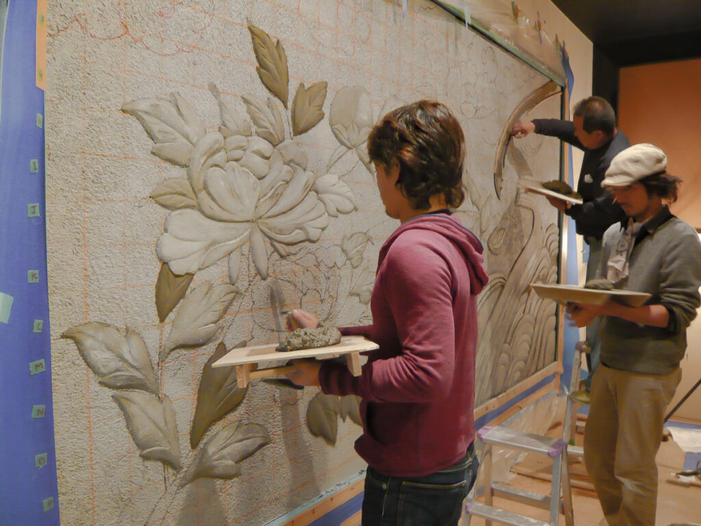 左官独特の色合いや表現で色の違う材料を塗り付け掻き落として柔らかく見える様にデザインしました