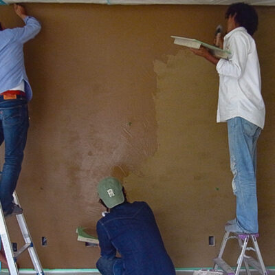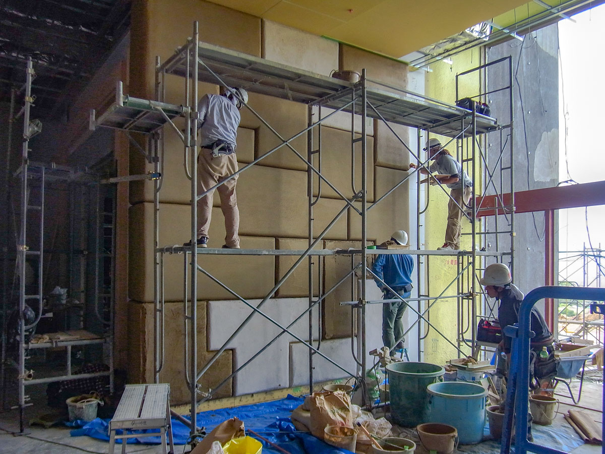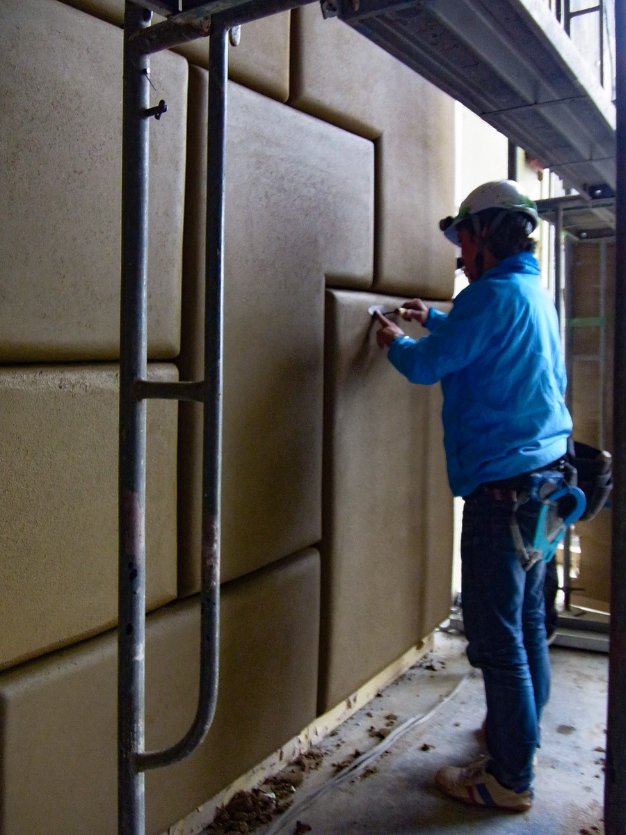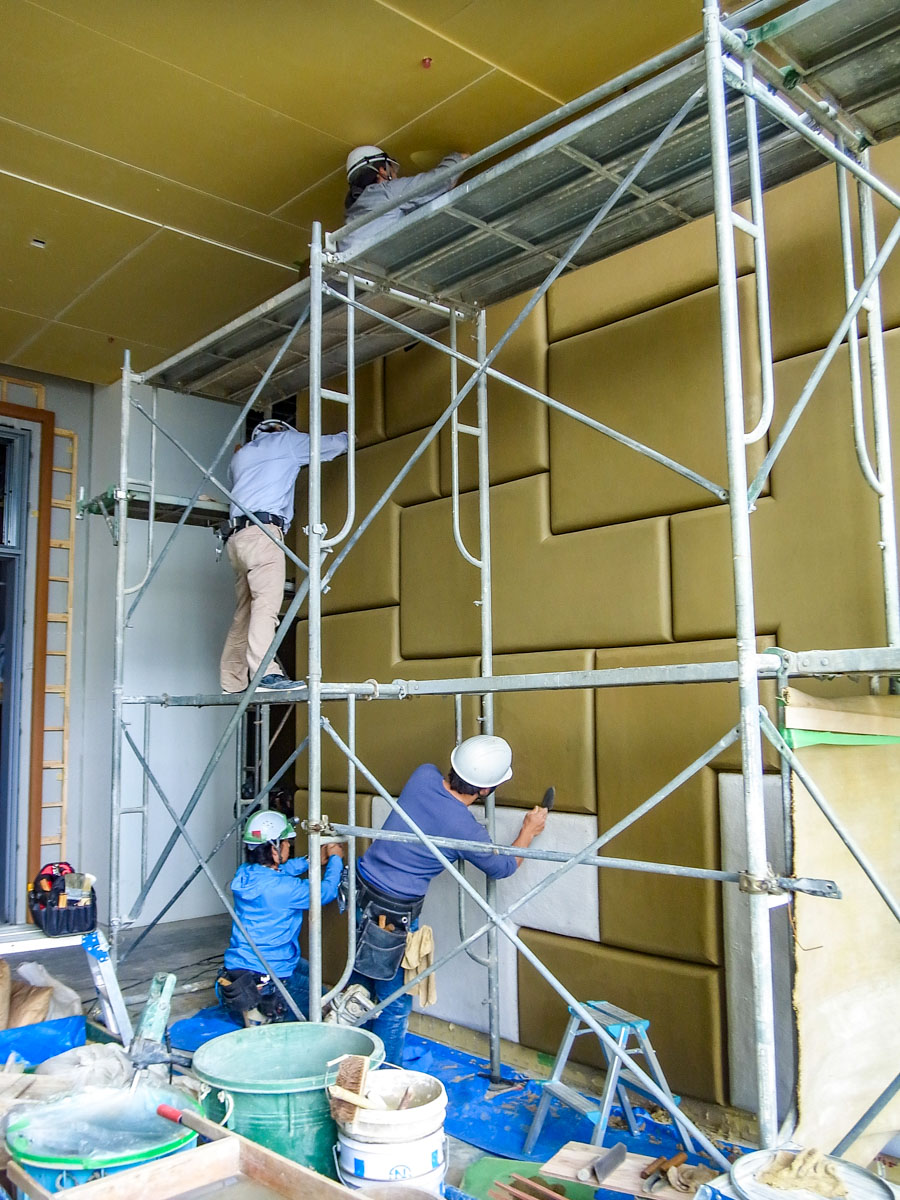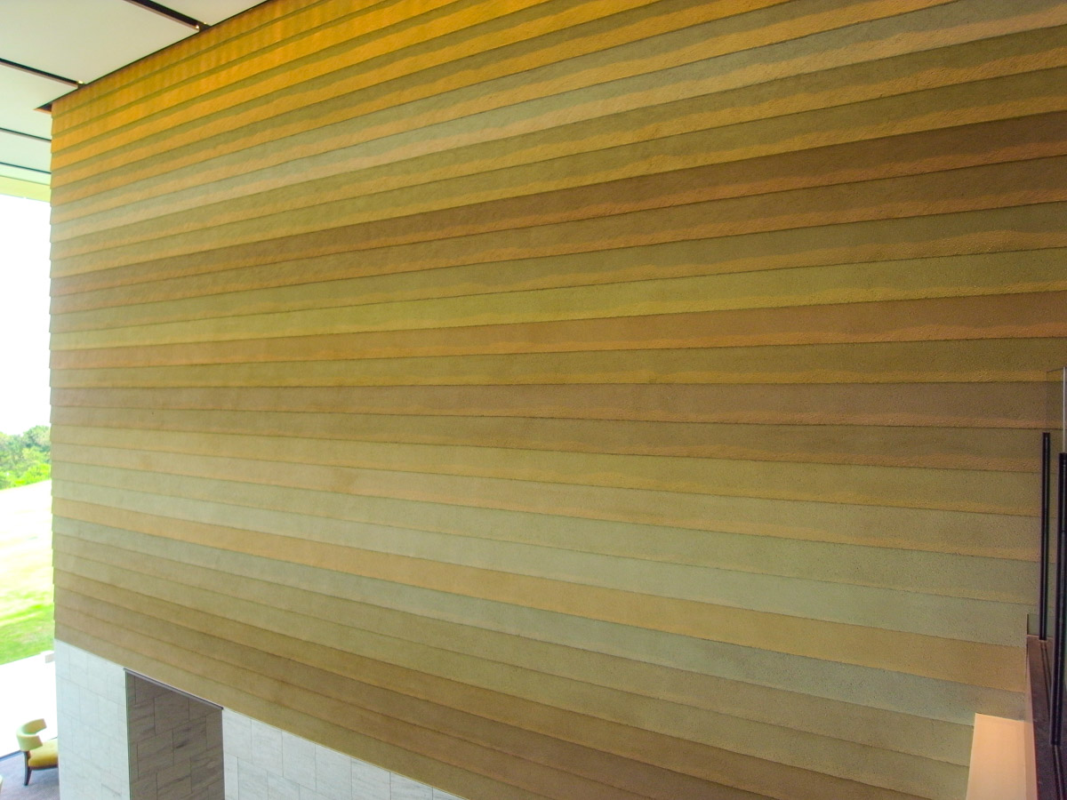 土と掻き落とし仕上げで30段のグラデーションの壁を完成させました