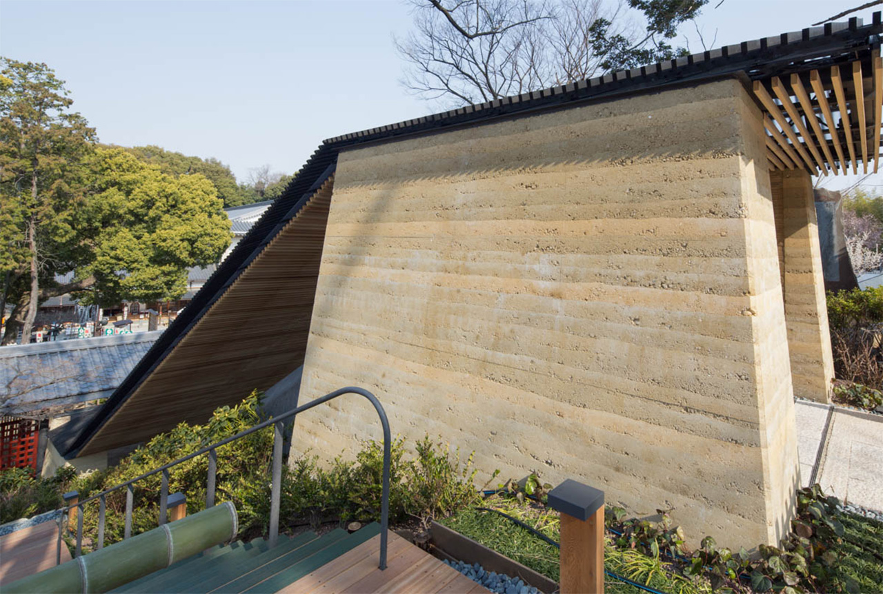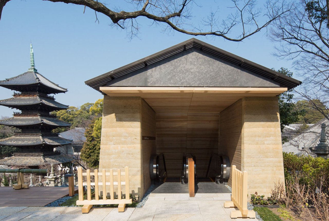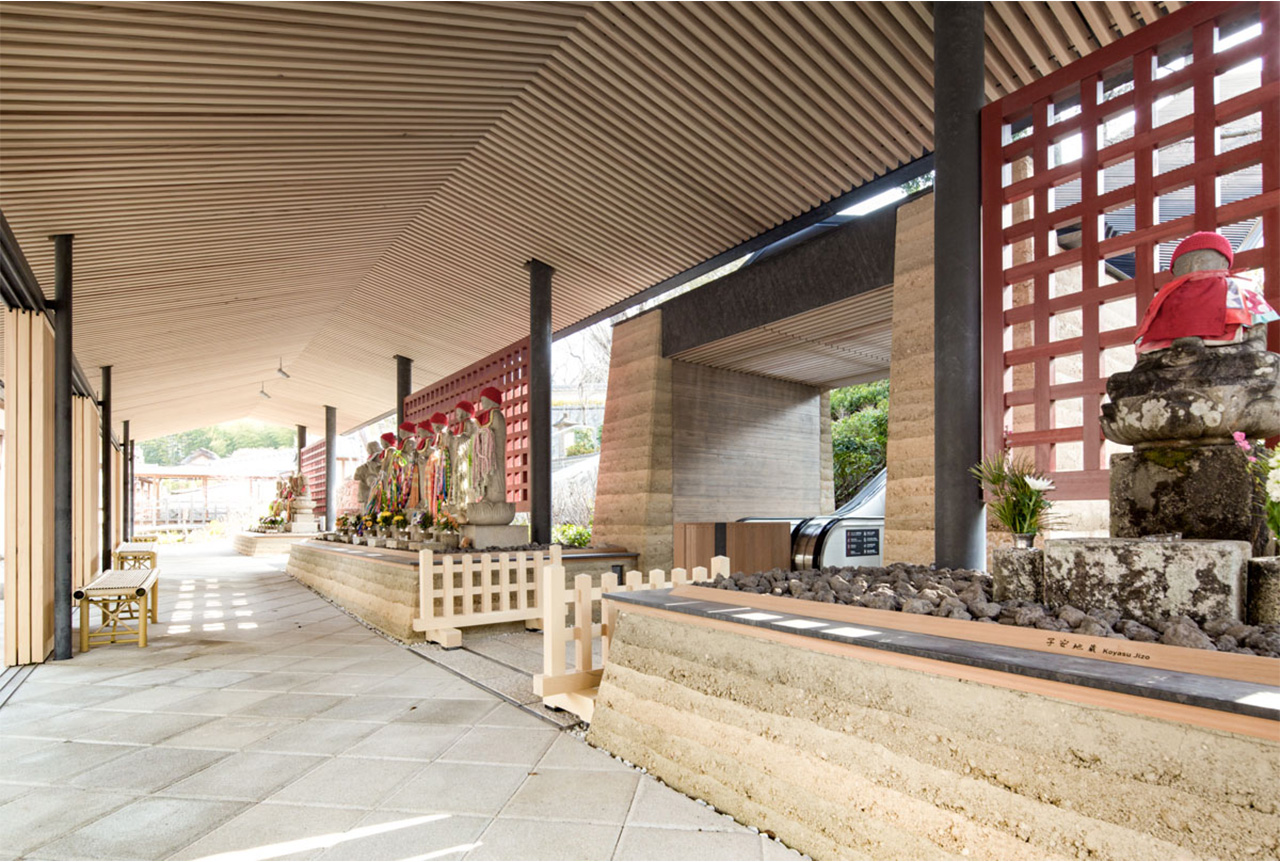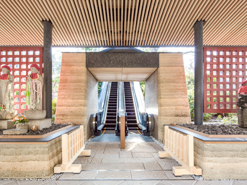 足腰に不安のある方でも気軽にアクセス出来る為に導入されたエスカレーターホールを版築で仕上げました。