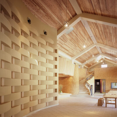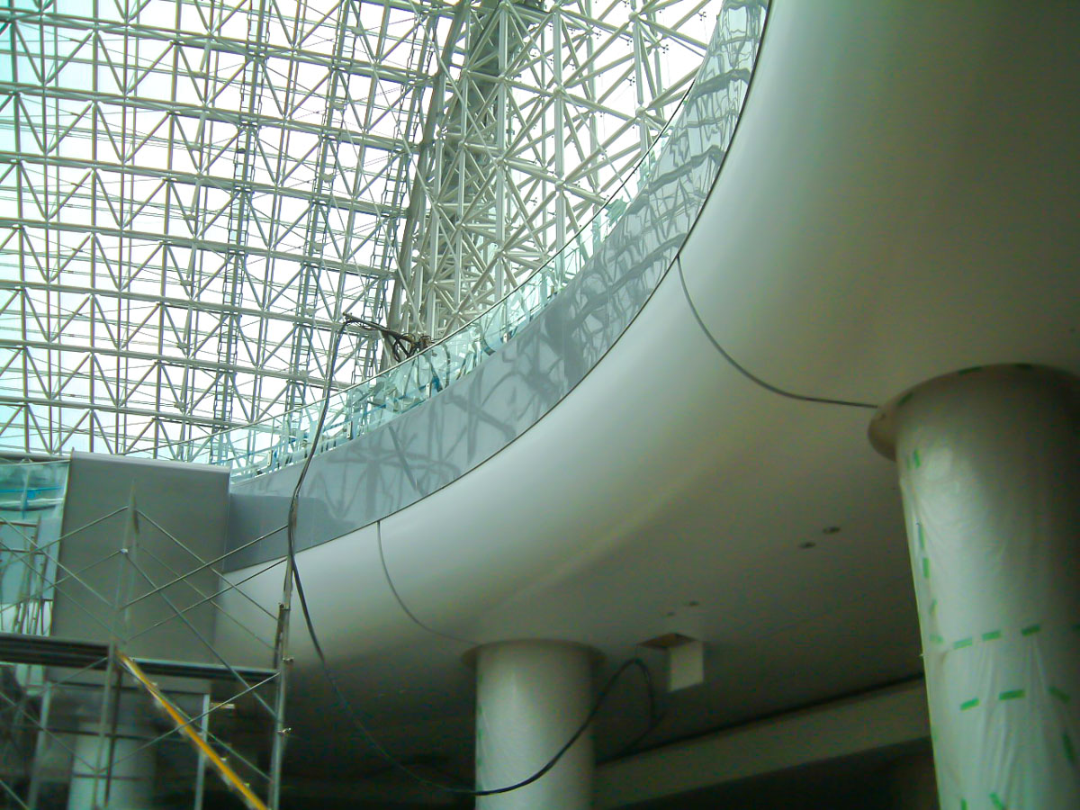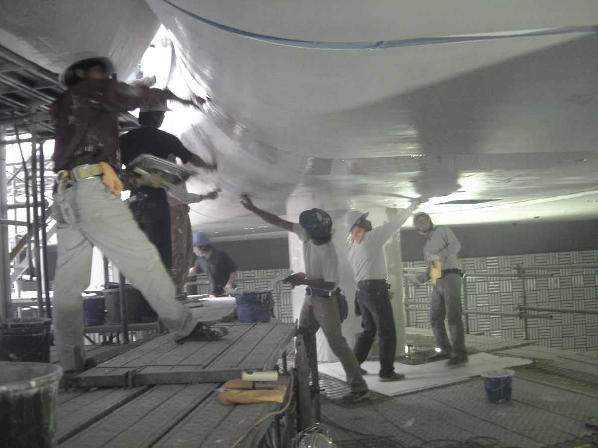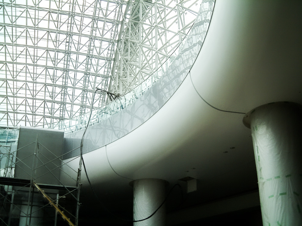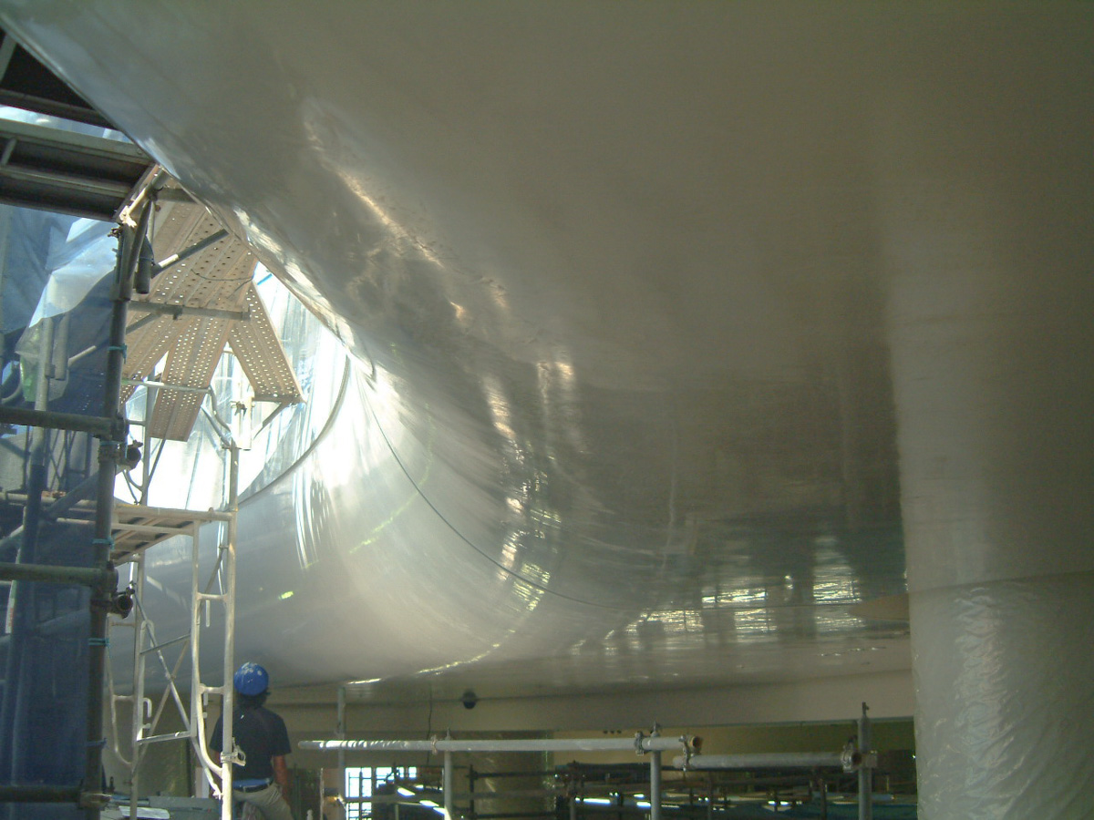 360度のドーナツ型三次曲面の天井360㎡を白漆喰の磨きで仕上げました。
