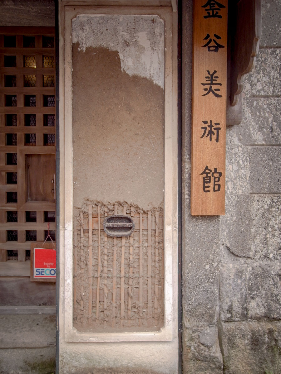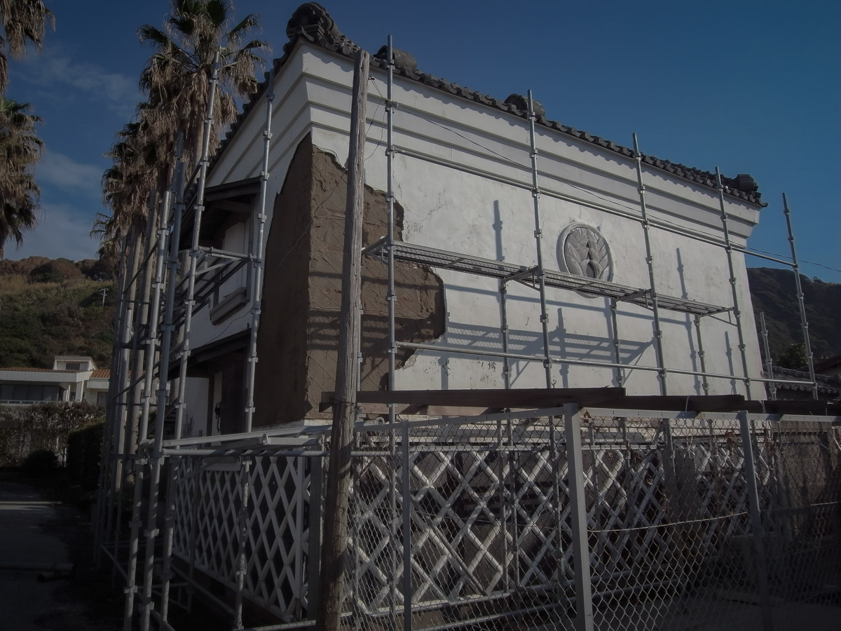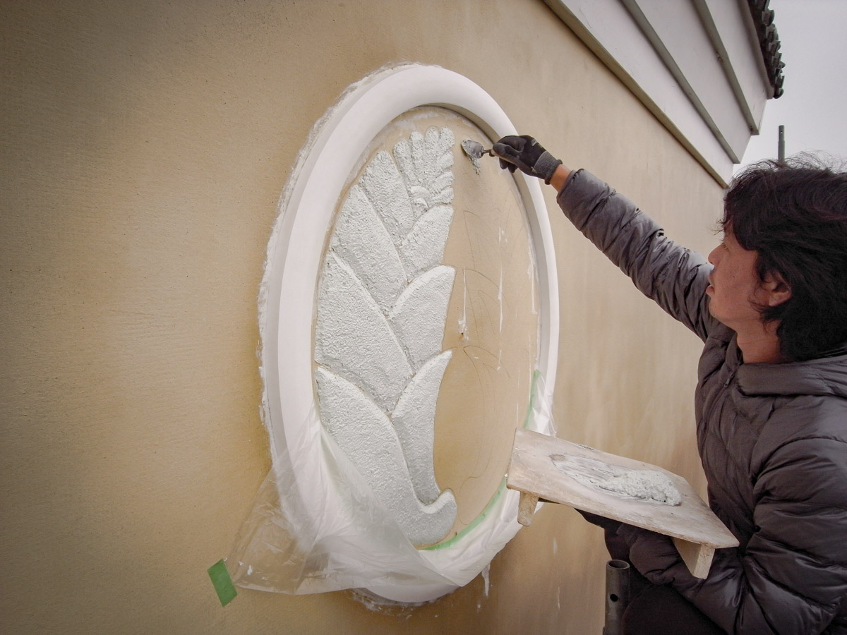 大正期に建てられた石蔵の外壁、漆喰の壁、家紋、黒磨きの扉を修復・復元しました。