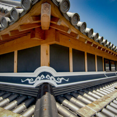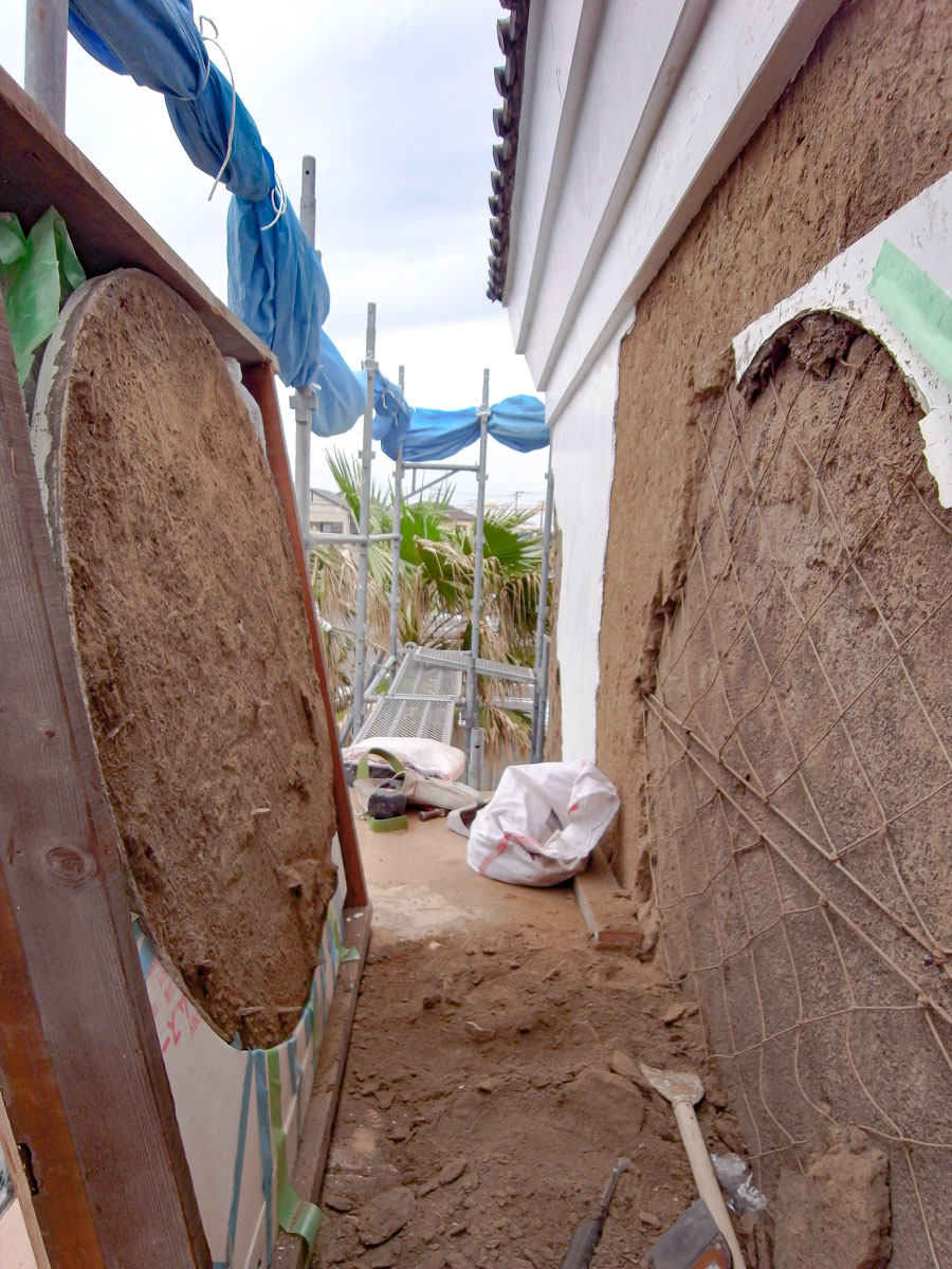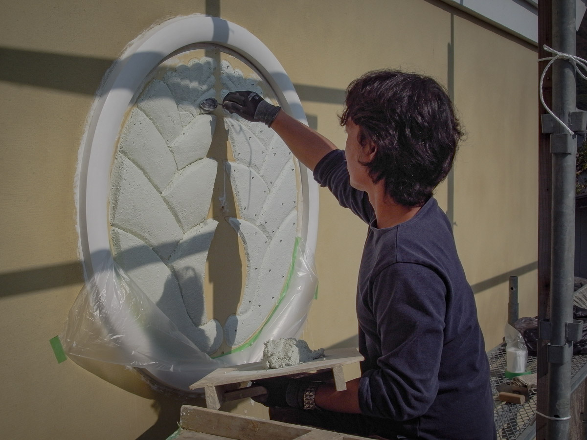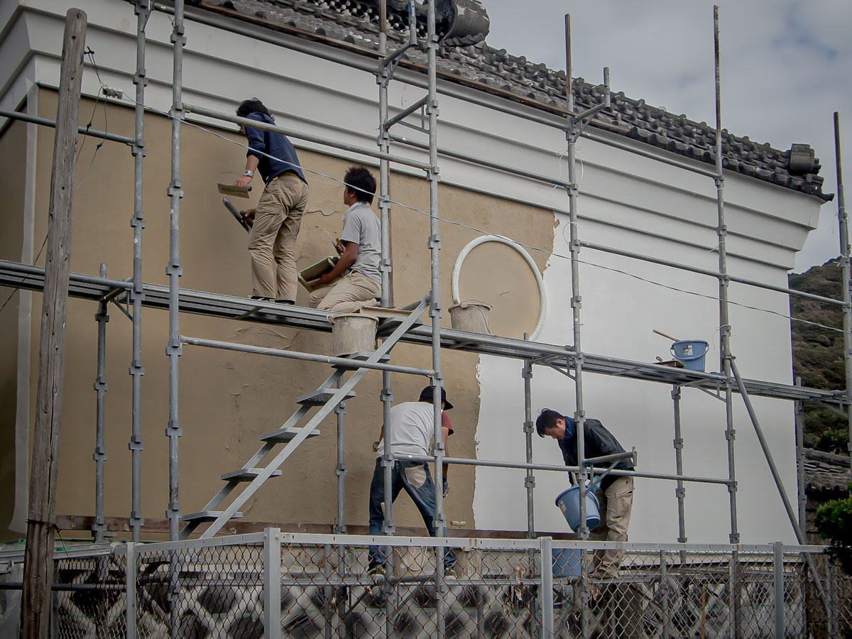 大正期に建てられた石蔵の外壁、漆喰の壁、家紋、黒磨きの扉を修復・復元しました。